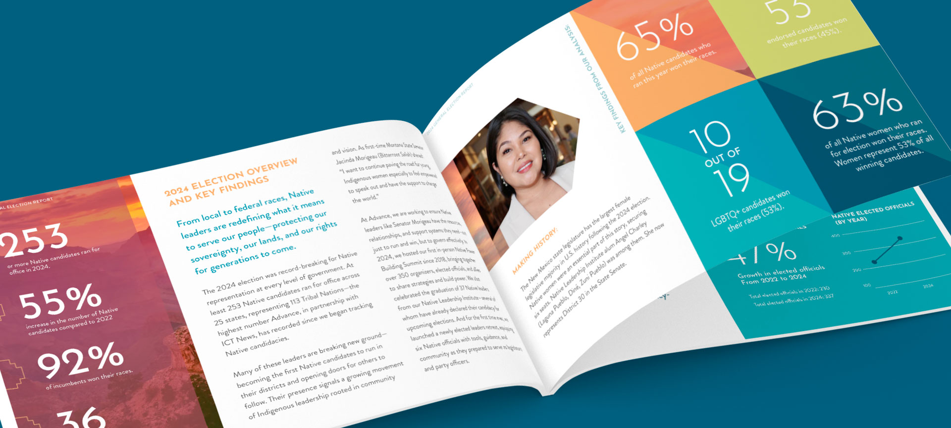 Advance Native Political Leadership is a national nonprofit building Native power by recruiting and training leaders, organizing communities, and using education and data-driven research to expand impact. We partner with Advance to strengthen and unify its communications across channels. We support strategy, messaging, and copywriting, then bring it to life through design for email and social campaigns, printed collateral, and reports, helping Advance show up with clarity and consistency across audiences.