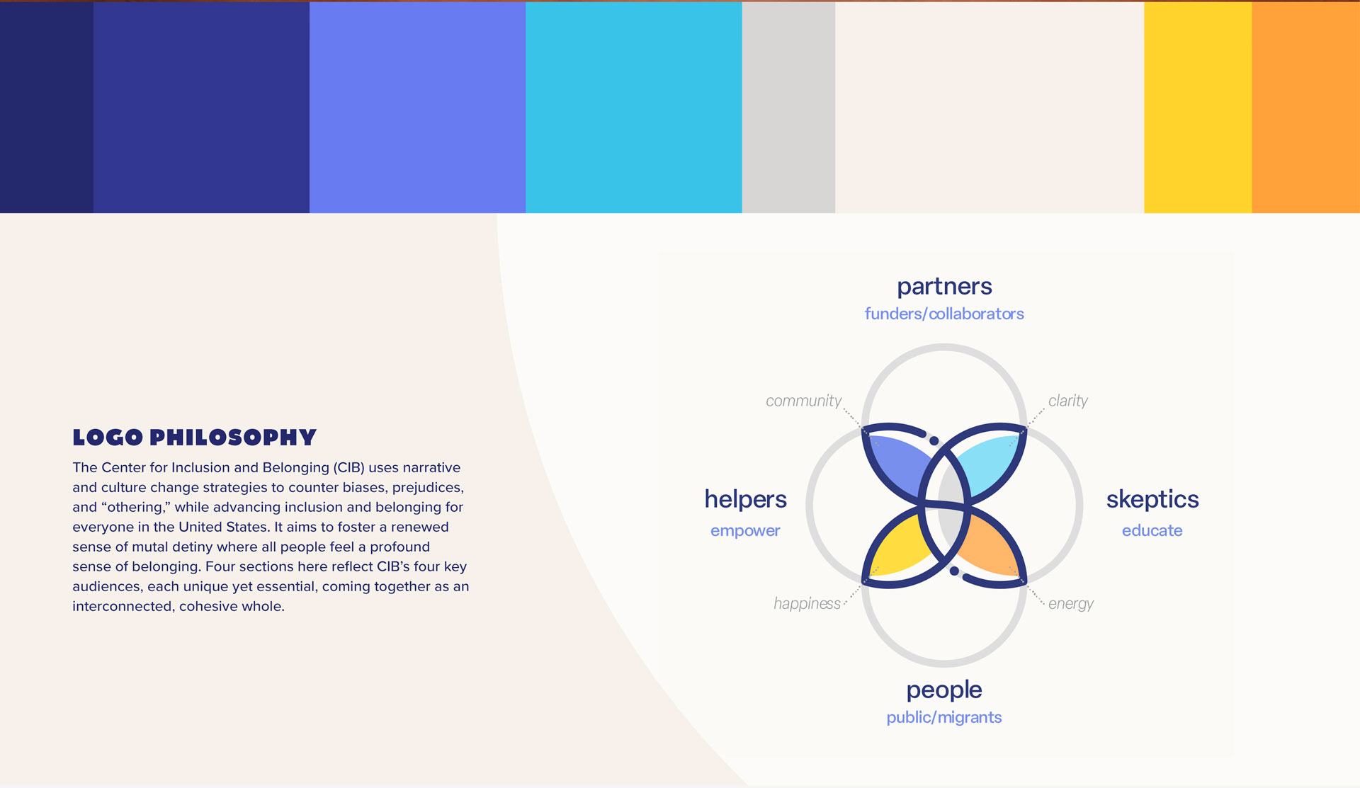The Center for Inclusion and Belonging (CIB), a project of the American Immigration Council (AIC), advances inclusion through values-driven programming, storytelling, and community engagement. We built a brand identity system for the CIB that stands on its own and aligns with AIC’s broader ecosystem. The logo represents transformation, unity, and migration. The four “winged” sections reflect CIB’s four key audiences, each unique yet essential, coming together as an interconnected, cohesive whole. The mark underscores CIB’s belief that belonging is built through connection.